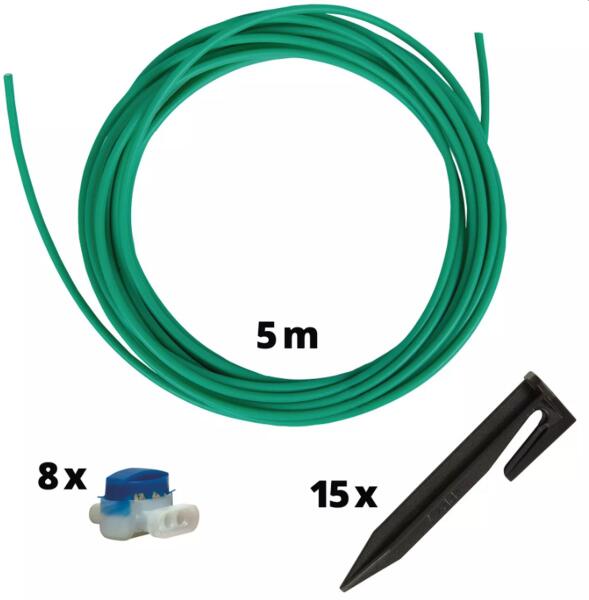 Einhell 3414026 Határoló vezeték javító készlet A javítókészlet egy robotfűnyíró-tartozék a megszakadt rögzítőhuzalok javításához. A javítókészlet az összes határolóhuzalos Einhell robotfűnyíró-készlethez használható. A készlet 15 db rögzítőkampót, 5 db összekötő kapcsot és 5 méter határolóhuzalt tartalmaz. Szállítási terjedelem: